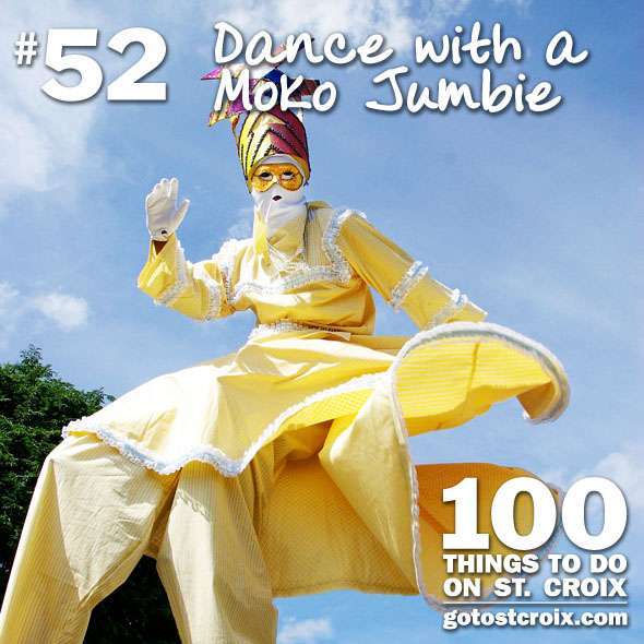 Moko Jumbies are a cultural icon here on the island of St. Croix, and dancing with one of these talented stilt dancers should be on the top of every visitor’s ‘must-do’ list. Moko Jumbies have been part of the Virgin Island’s cultural heritage for over 200 years, and their origins can be traced to Africa as far back as the 13th and 14th centuries. Moko Jumbies are said to ward away evil spirits (or ‘jumbies’) from parades, gatherings, and festivals by standing on 10-20 foot high stilts, making them tall enough to reach the evil spirits and drive them away from the crowd. Moko Jumbies are generally covered from head to toe in elaborate costumes, hats, gloves, and masks. The story goes, that the Moko Jumbie must be completely covered (except for their eyes) so that the jumbies don’t recognize them.