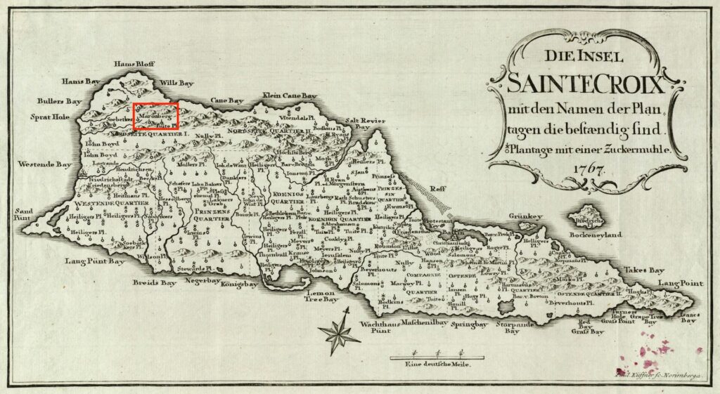 The northwest of St. Croix was known for its large Maroon community from 1650 through 1767, in fact the area was named Maronberg on a 1767 Danish map of St. Croix. The population census of 1791 shows 953 free Africans; 12,096 African slaves; and 1,385 runaways, for a total of 14,434 Africans on St. Croix. During this census period over 10 percent of all slaves had run away and were on their way to join the community at Maroon Ridge to escape on stolen vessels to nearby Puerto Rico or other Caribbean Islands. On St. Croix, as in other Caribbean islands, Maroons built independent communities that resisted colonial control. They settled in hard-to-reach areas, like the Maroon Ridge area, giving them safety and freedom. They grew their own food, hunted, and sometimes raided plantations for supplies. These Maroon communities sometimes worked with enslaved people from the surrounding plantations, offering support and shelter. Together, they played a key role in several uprisings on the island.